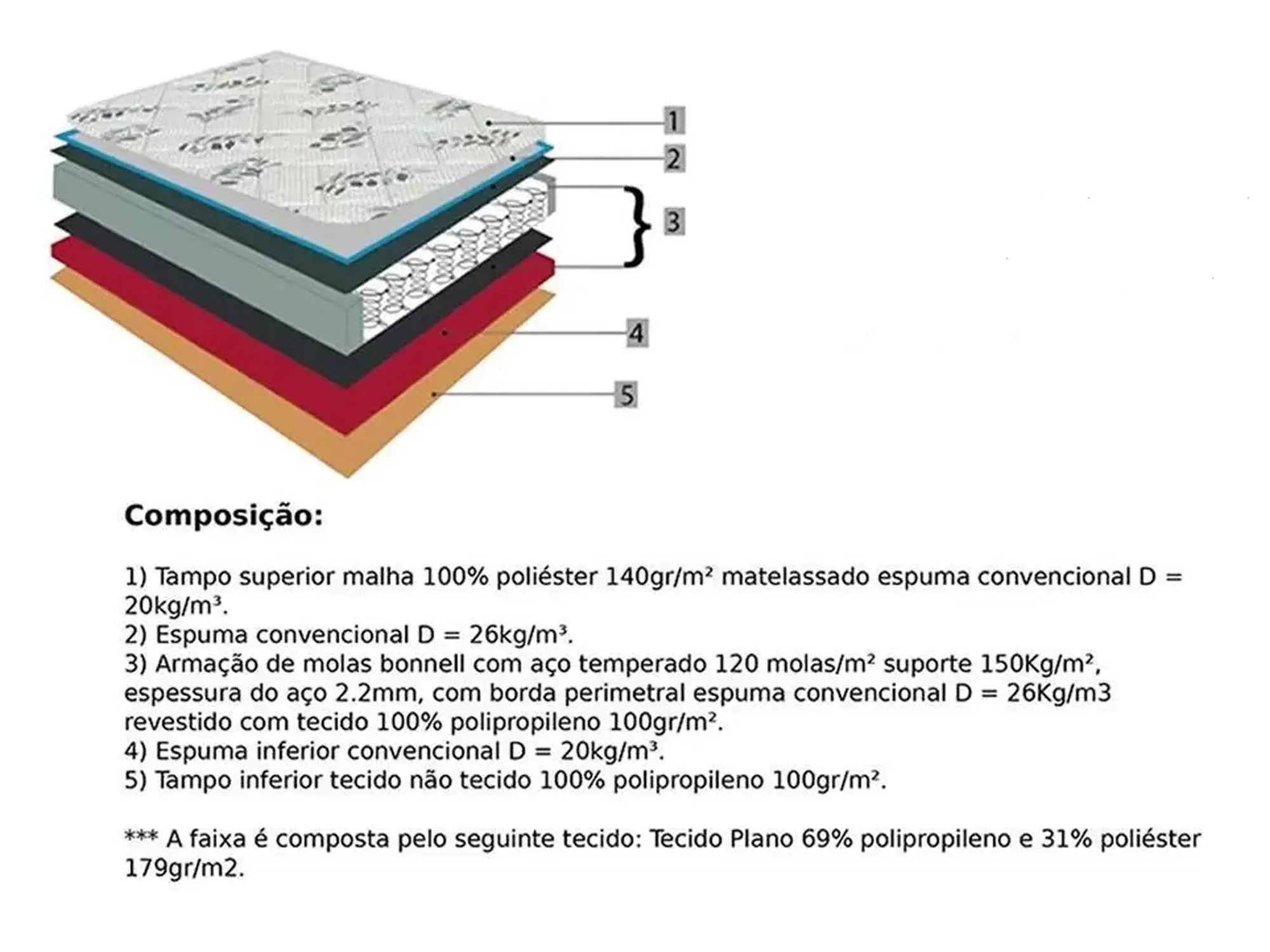 Molejo: Molas bonnell / Espessura do aço 2.2mm, com borda perimetral espuma convencional D26.