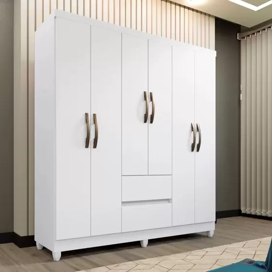 O Roupeiro Lisboa da Imop Móveis possui 04 portas e 02 gavetas, prateleira, espaço para roupas longas, cabideiro em madeira revestida com PVC. Tudo isso com um amplo espaço para armazenamento.